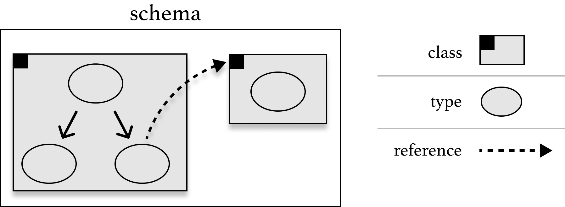 A value of a reference type is an element of the referenced class. Sometimes we'll call this value a pointer. Recall this diagram of a schema...